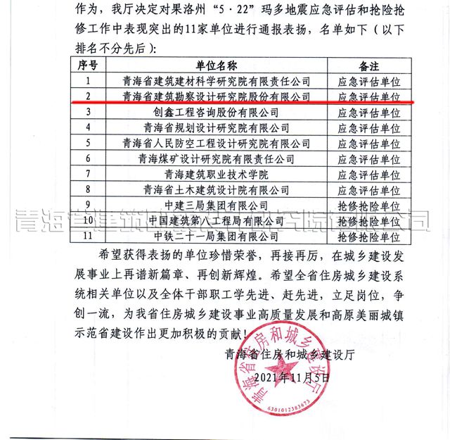 近日,青海省住建廳下發(fā)青建設(shè)[2021] 317號(hào)文件,對(duì)在果洛州“5. 22”瑪多地震抗震救災(zāi)工作中表現(xiàn)突出的11家單位和企業(yè)進(jìn)行表?yè)P(yáng)通報(bào),我公司在表?yè)P(yáng)通報(bào)之列。